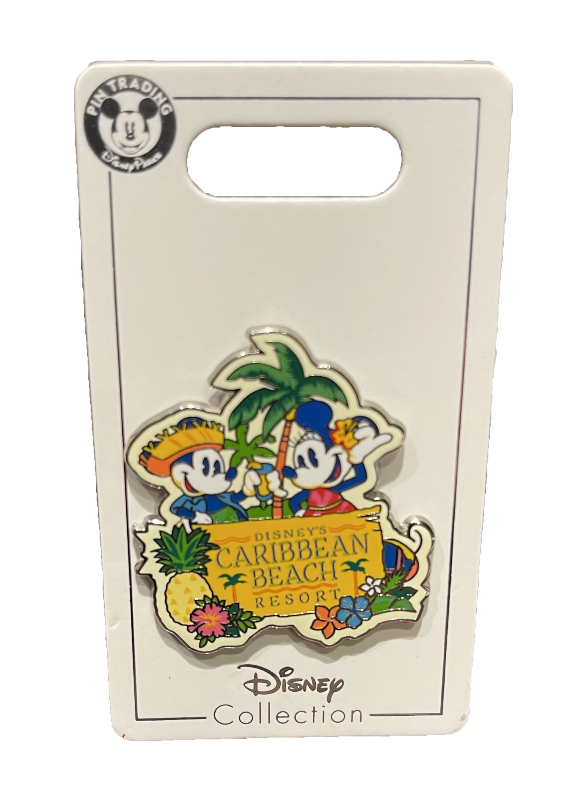 Bring home memories of your Disney Vacation at Caribbean Beach Resort with this trading pin. Features Mickey and Minnie Mouse.