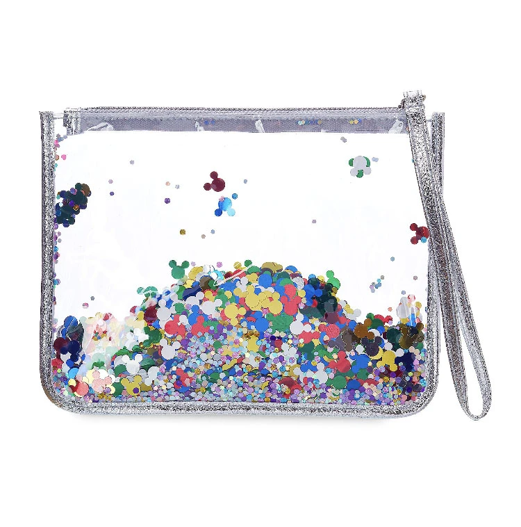 Make every day feel like a celebration when you carry around this Mickey Mouse pouch. The clear PVC design has double-skinned sides filled with colorful metallic Mickey icons which move around when you do.