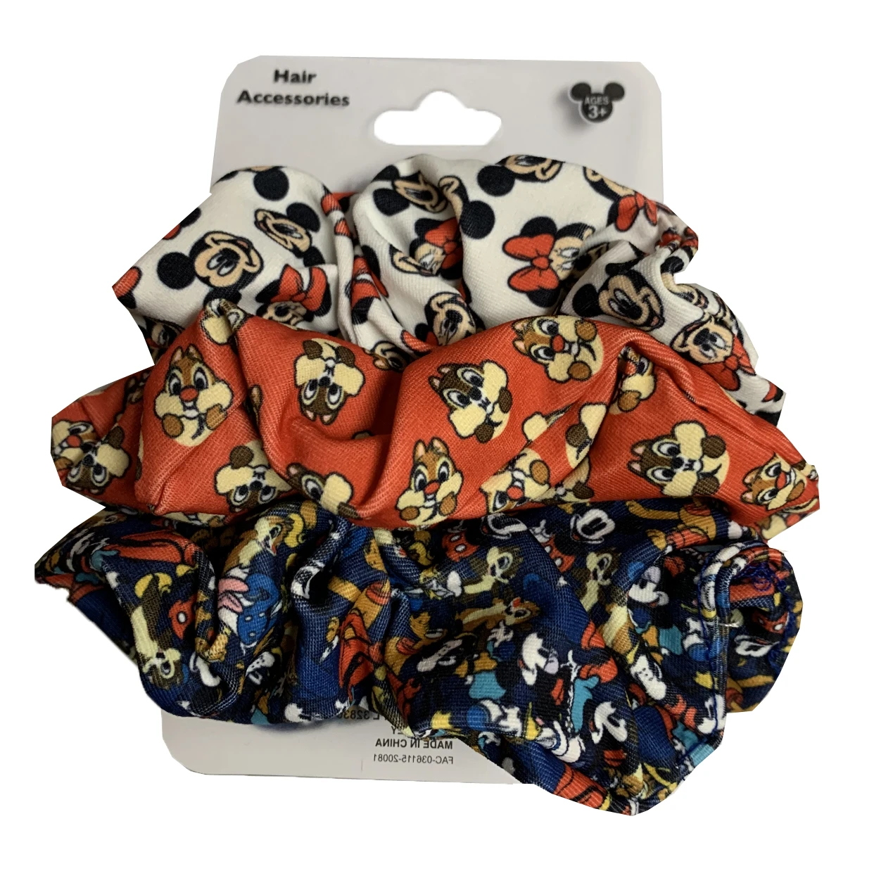 Wear a piece of Disney, with these fun hair scrunchies. Features 3 scrunchies, the first one has Mickey and Minnie, the second one has Chip n Dale, and on the last one it has Mickey Mouse and all his Pals.