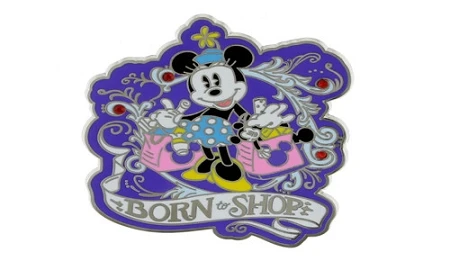 Open edition Minnie Mouse born to shop pin. This pin features a print screen element.